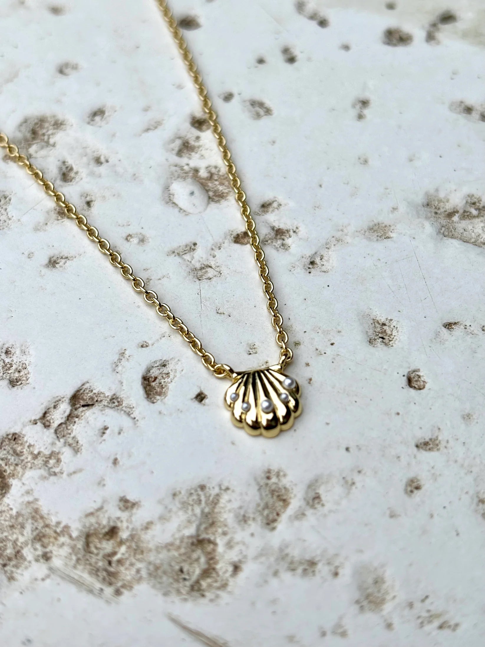 Sweet, coastal, and effortlessly chic, the Shelly Necklace features a delicate mini seashell charm accented with tiny pearl insets. Suspended from a fine gold-tone chain, this piece brings a soft, beachy elegance to any look—perfect for everyday wear or adding a subtle seaside touch to your layers.