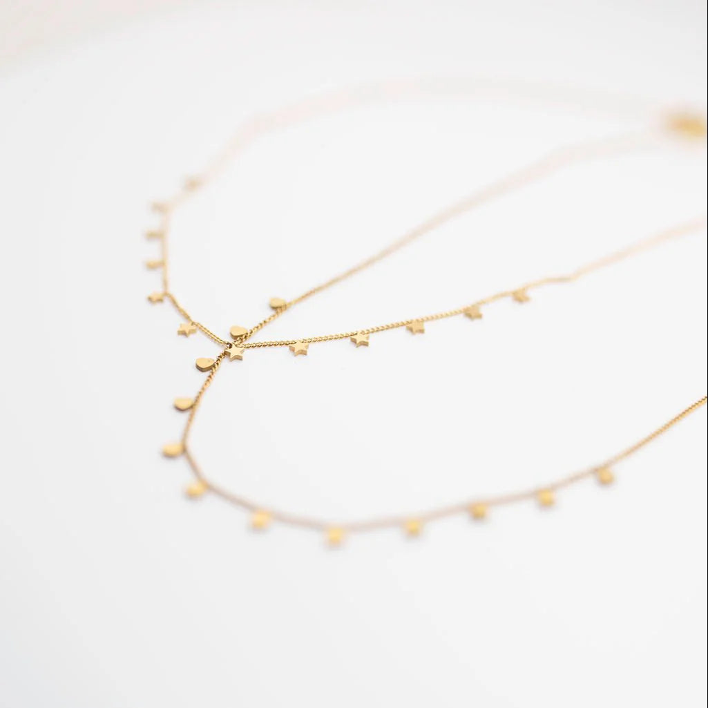 Delicate, dreamy, and made for everyday layering, the Stella Necklace features the tiniest starcharms suspended from a fine, lightweight chain. Designed to drape gracefully along the neckline, this sweet piece adds just the right touch of sparkle whether worn solo or stacked with your favorite layers. It’s effortlessly romantic, subtly playful, and endlessly wearable.