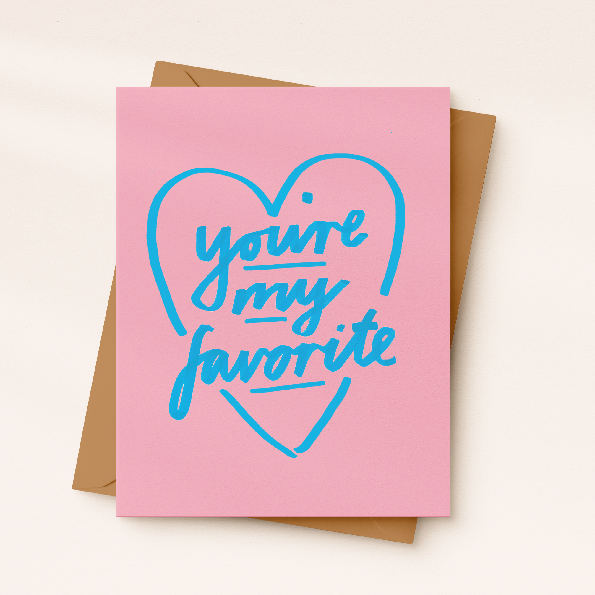 Bright, bold, and full of charm — the You’re My Favorite card is made for that special someone who makes every day better. Featuring playful hand-lettered text inside a sketched heart on a soft pink background, this cute card captures all the feel-good energy of love, friendship, and genuine affection.