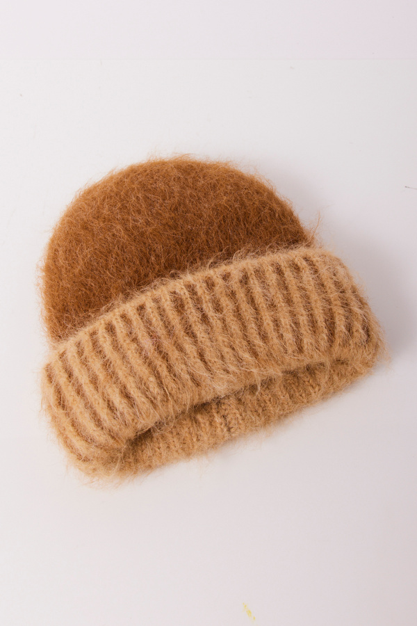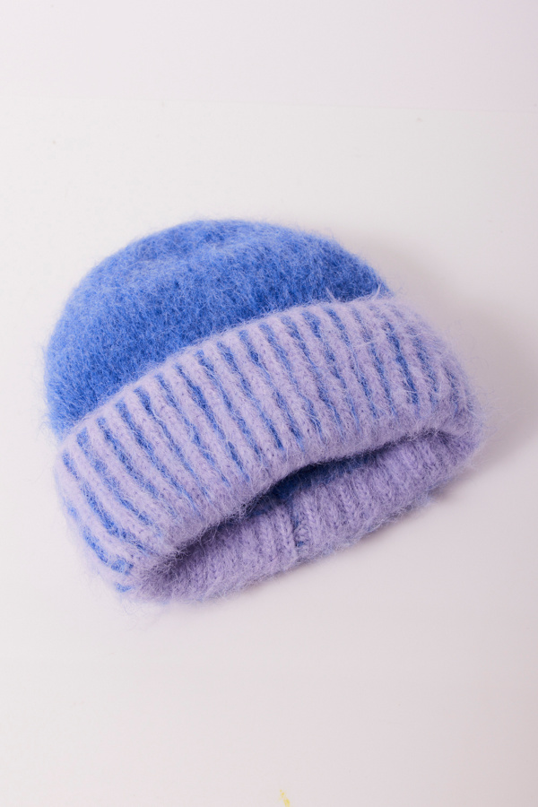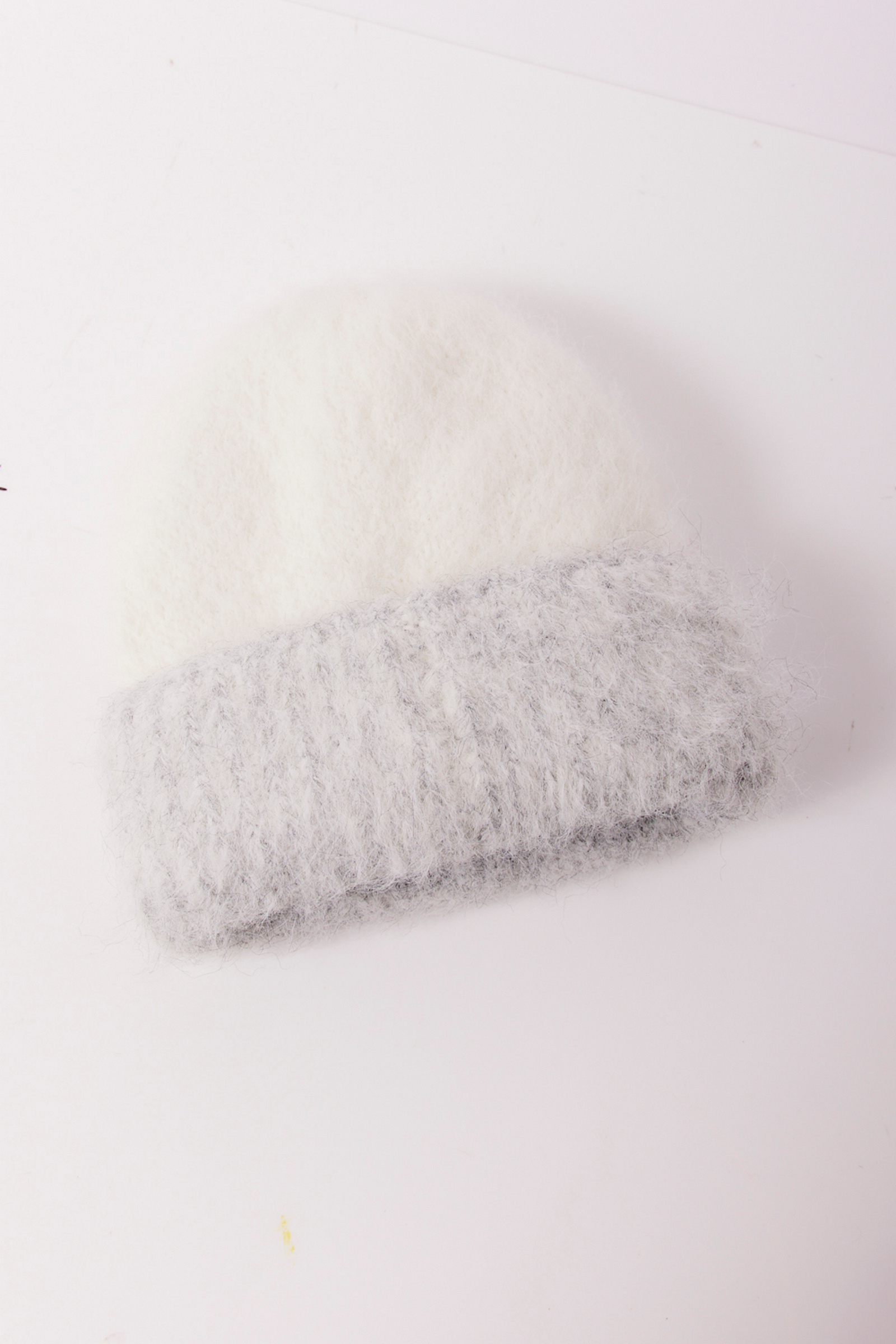 Features: Rolled cuff, ribbed detailing, contrasting bottom, fuzzy fabrication