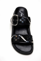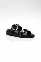 Cool and casual, these easy slide sandals are featured in a classic double-strap design with studded details for an eye-catching accent.