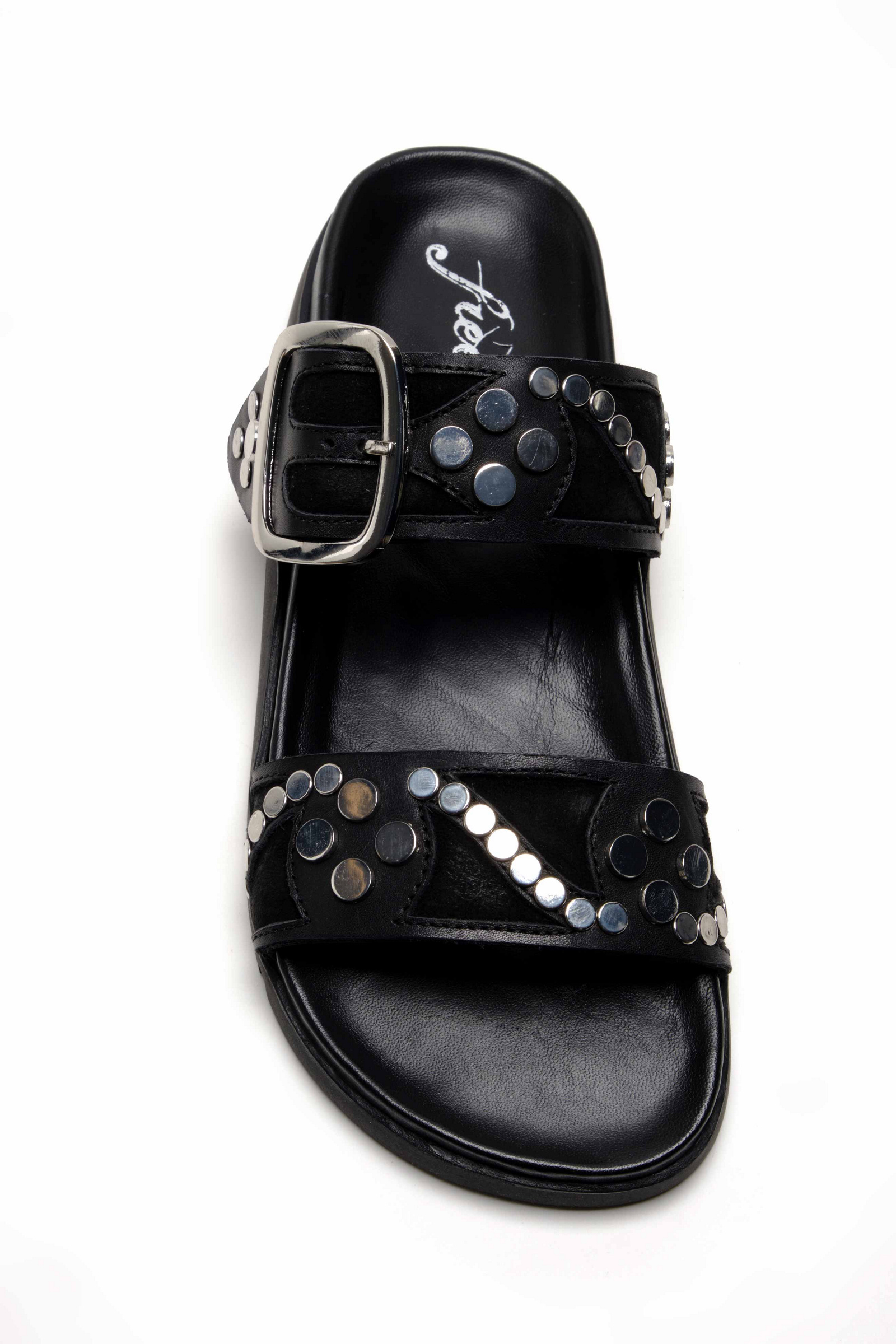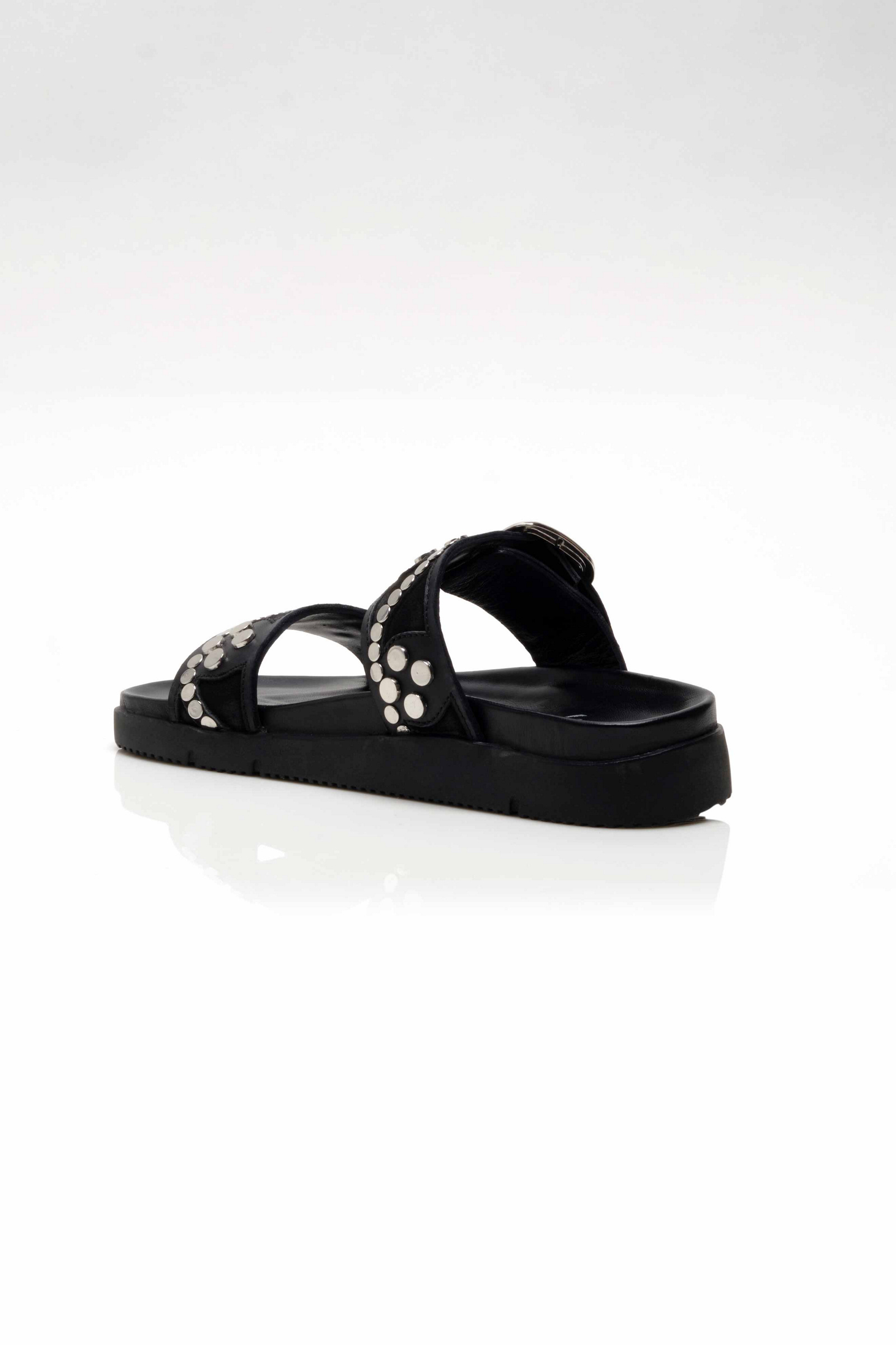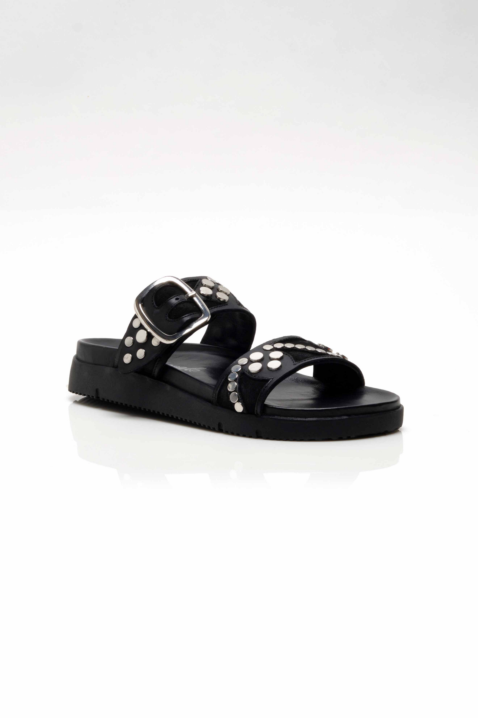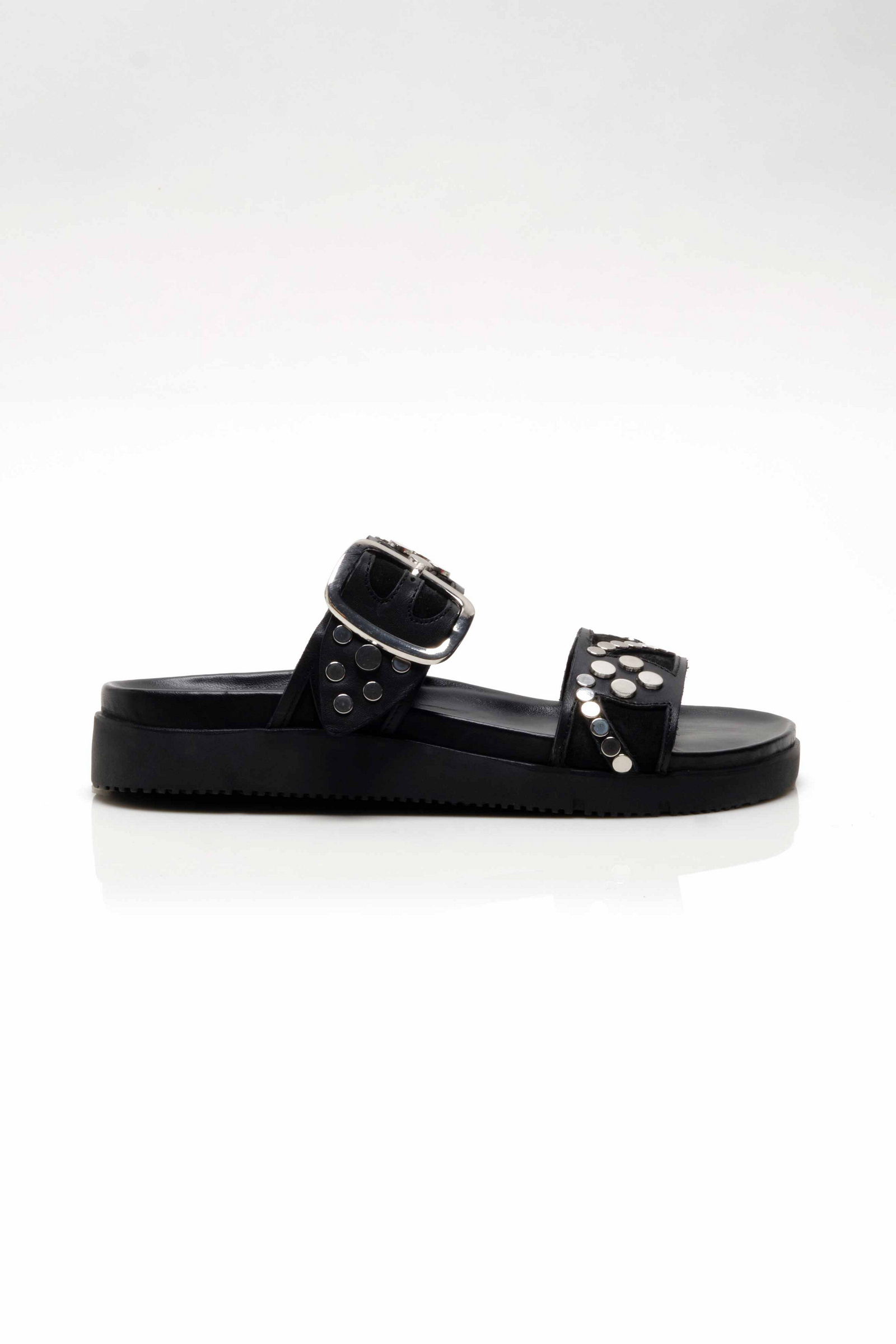 Features: Slip-on style, backless, double leather strap design, adjustable buckle closure, molded footbed, suede and stud details, tread outsole