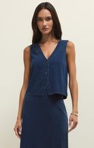Detailed with a button front, v-neck, and lightweight textured knit fabric, this sleeveless top will be a forever staple in your wardrobe. Make it your go-to outfit with its matching pant or denim.