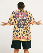This standard cut tee drips with nostalgia: think vintage gig-poster graphics, leopard print for days, and a lick of flames because… why the hell not?