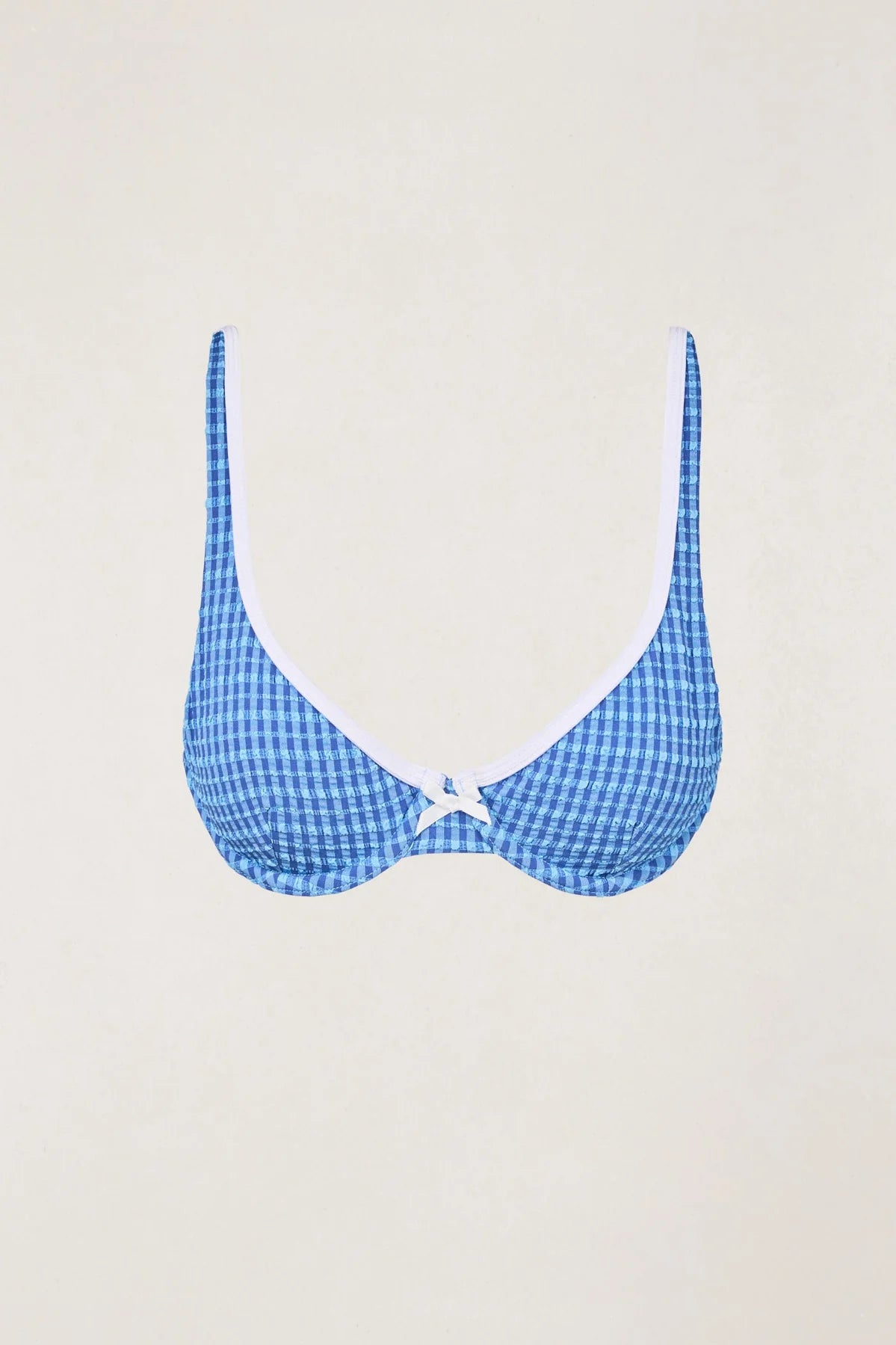 The Lola Check Underwire Top combines contrast rib binding, a satin centre bow, and adjustable straps for a feminine look. Finished with an adjustable back tie and supportive encased underwire.