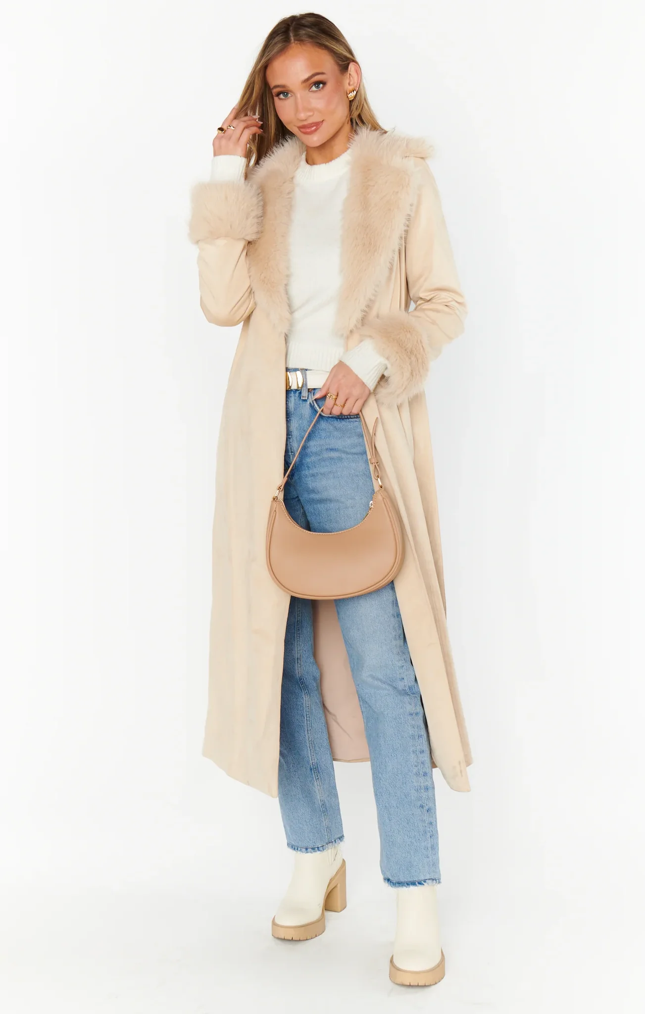 The Penny Lane Coat is a rock star's dream! This coat hits a bit above the knee, and has a faux fur collar, belt loops, and a detachable belt! Add some sass to any look with the Penny Lane coat!