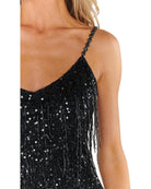 They'll see sparks fly whenever you're around! This fun little party starter features dramatic fringe and shiny silver sequins. Alluring v-neckline, curve-hugging silhouette, and flirty mini skirt make this perfect for a bach weekend or NYE look. Style with matching statement-making accessories.