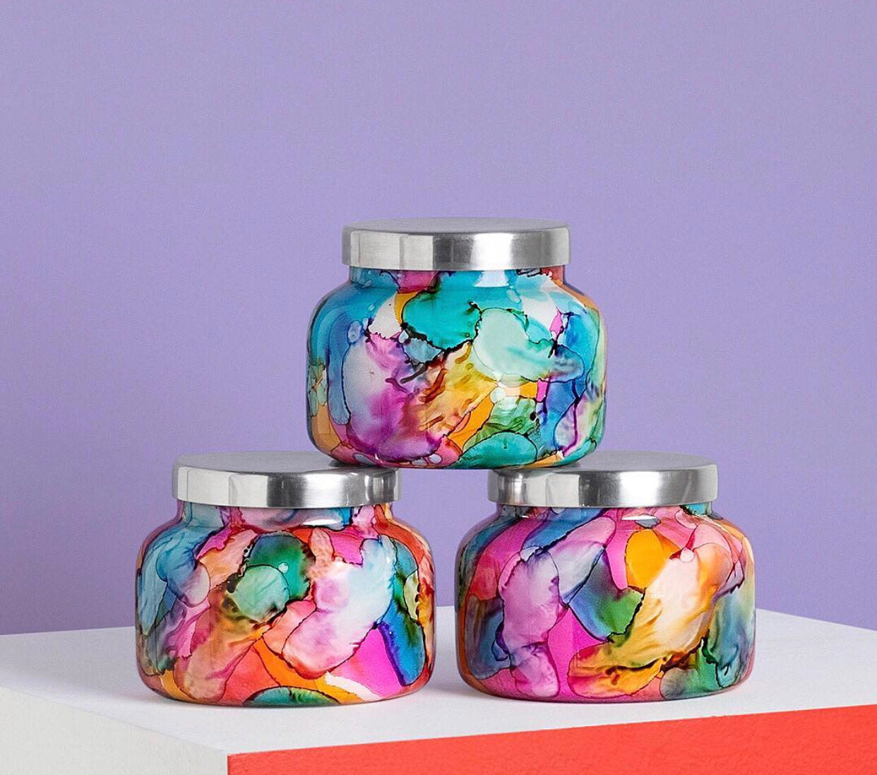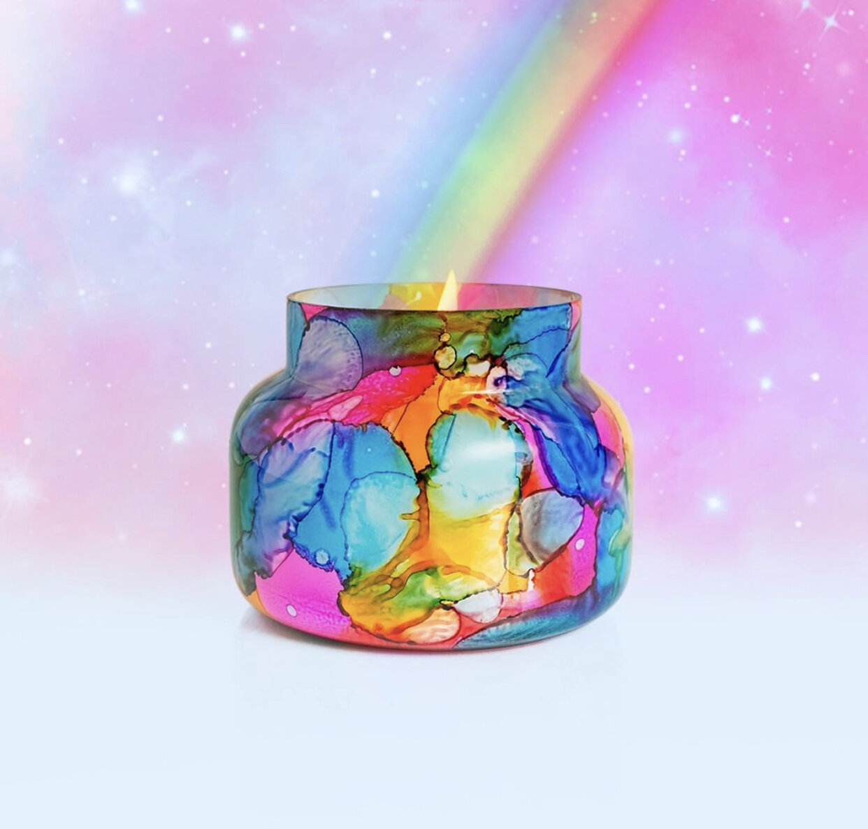 The 19oz Rainbow Watercolor Signature Jar is beautiful, vibrant and features the universal favorite fragrance – Volcano! This Rainbow Jar is a CB showstopper with delicious notes of tropical fruits and sugared citrus and intricate one-of-a-kind detailing.