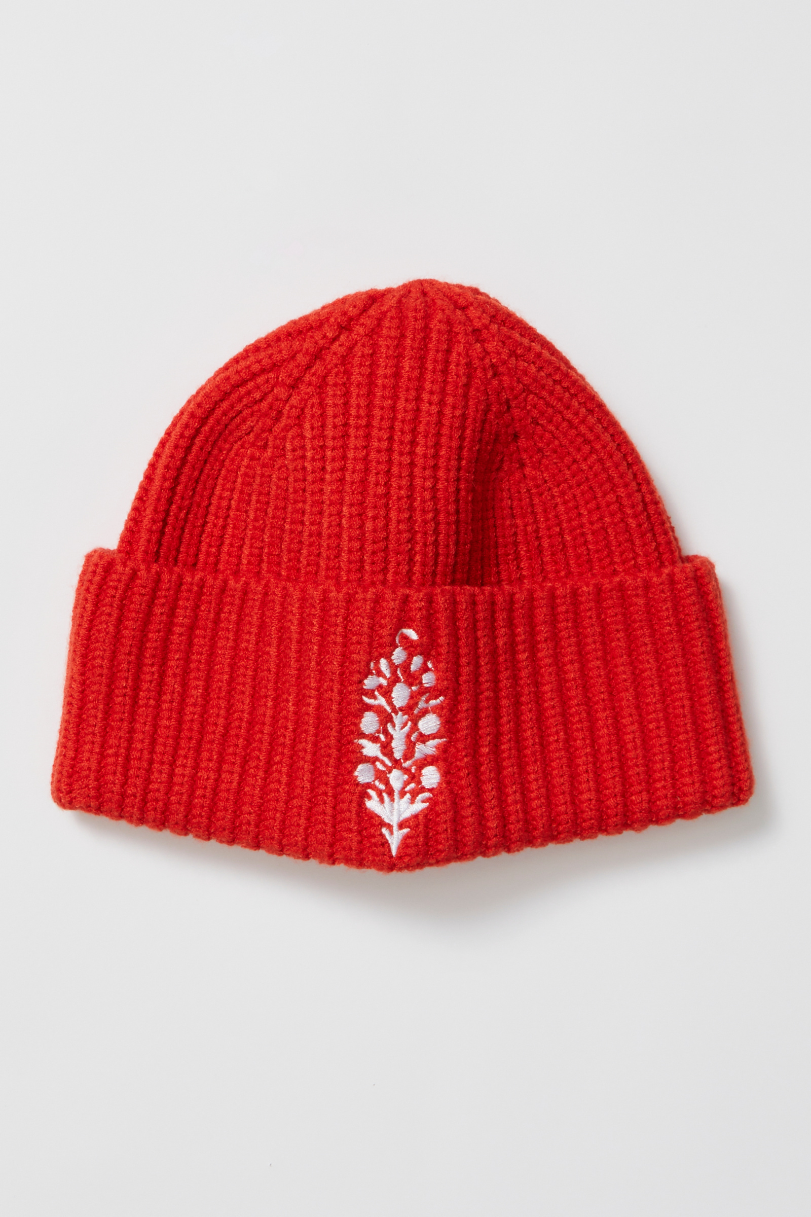 Chunky ribbed knit beanie with a wide cuff and oversized embroidered logo detailing.