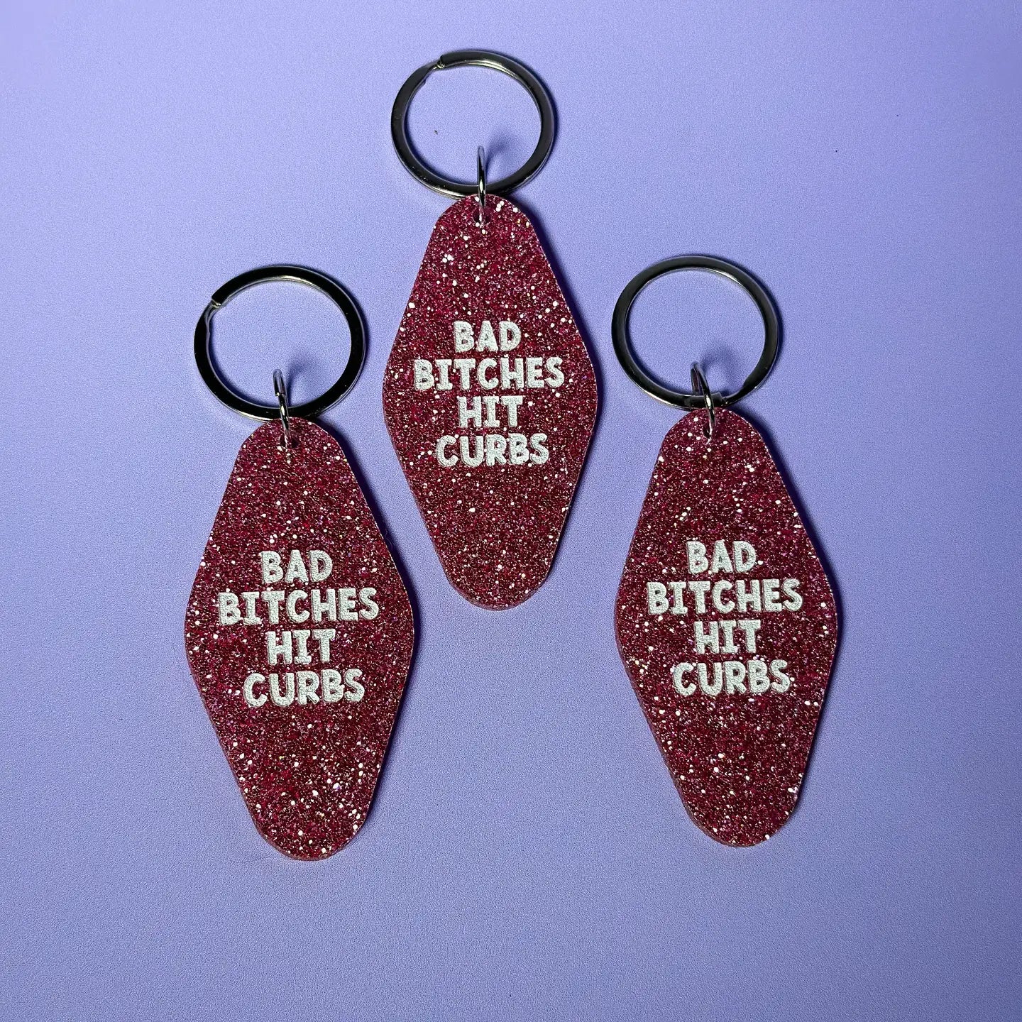 Own your quirks with our 'Bad Bitches Hit Curbs' keychain, dazzling in magenta glitter. At three inches long, it's a sassy accessory that champions those unexpected hiccups in life. Attach it to your keys and let it be your cheeky reminder that even the fiercest of us have their 'hit the curb' moments!