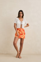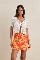 The Gigi Lace Short Sleeve Top in White is designed with a fitted silhouette, V neckline, and tie front detail. Soft babylock edges finish the piece with a delicate touch.